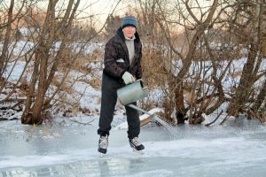 Вот уже пятый год подряд 72-летний пенсионер выходит на лед, чистит от снега площадку и заливает из лейки каток.