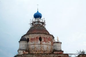 А на прошлой неделе на храм подняли новый ярко-синий металлический купол и крест, которые теперь хорошо видны с трассы Родники — Шуя. Священнослужители провели молебен, и работа снова закипела с прежним рвением.