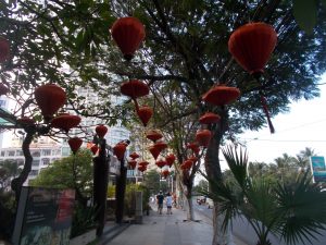 День казался облачным, не жарким, море с волнами было прелестно. В легкой дымке сеть островов окружала залив. Купались лишь те, кто не боялся пройти широкую жесткую полосу прибоя в несколько крутых волн, чтобы оказаться в водной болтанке с белыми гребешками и с моря посмотреть на Нячанг. Каждая четвертая волна превышала рост человека. Никакой службы спасения на побережье мы не видели. Изучив карту побережья, вечером отправились знакомиться с южным городом под вечный шум прибоя. Курорт Нячанг оказался не только современным центром, но и очень красивым в фиолетово-розовом сумраке заката, в цветных предновогодних огоньках аллей, улиц, елок, деревьев и неповторяющейся подсветке зданий и отелей. Высотные строения, сливаясь в темноте друг с другом, словно соревновались в высоте, красоте отделки, в переливающемся, скользящем и ниспадающем неоновом освещении. А справа напротив сиял огнями остров Хон Че с его известным парком развлечений мирового уровня Винперл (Vinpearl) — «Вьетнамская жемчужина». Для всех приезжих остров называется по имени парка — остров Винперл, который основал первый миллионер Вьетнама Фам Нят Выонг. Его канатная дорога в 3300 метров на огромных опорах от Нячанга к острову в темноте казалась хрустально-голубой. Пятнадцать минут ощущения полета в фуникулере над водой — и вы на острове! Богатые люди планеты, покупая номера в отелях острова, сразу получают право пользоваться бесплатно игровой зоной, аттракционами, игровыми автоматами, 5D кинотеатром, посещать дельфинарий, океанариум, аквапарк, пляжи с белым песком в закрытых от волн бухтах с кайтингом, водными скутерами, «бананами», манят кататься на электросанях и смотреть шоу фонтанов, как в Дубае. Остальные получают эти удовольствия за отдельную плату.