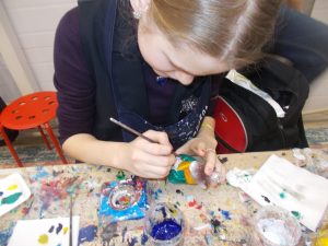 Ответственная за группу вновь привела всех в помещение мастер-класса, предложила одеть фирменные фартуки, раздала на выбор крупные цветные и простые шары, забавные фигурки мышек. Все дети выбрали мышат и в течение 40 минут разрисовывали милых животных. И хотя у всех перед глазами висели трафареты и готовые игрушки, каждый ребенок и взрослый творил свое чудо. С группой работал профессиональный художник, помогал отстающим, предлагал множество креативных решений, отчего игрушки становились еще привлекательнее. Тонкими кисточками дети подбирали краски, соединяли цвета и наносили их на свои произведения. Акриловые краски сохли практически моментально. Каждую игрушку мастер помогла упаковать в красивые подарочные коробочки и вручила юным художникам. Надо отметить, что даже при отработанном трафарете игрушки получились у всех неповторимыми и оригинальными.