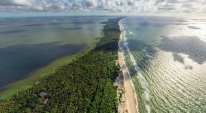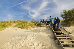 В этих местах снимали фильм «Остров сокровищ». Сегодня это самое посещаемое туристами многих стран место. Отличные песчаные пляжи с обеих сторон позволяют купаться в пресной воде залива (благодаря реке Неман) и в открытом соленом море. Со временем коса исчезнет, так как воды моря при штормах уже не раз размывали косу (последний прорыв был в 2019 г., и это при ширине косы в 1 км). Самое узкое место косы равно 380 м. Именно здесь мы осматривали косу на той и другой стороне с отличных высоких смотровых площадок на дюнах. Огромное количество ступенек к вершинам дюн сразу напомнили крутой подъем к памятнику советскому воину-победителю Алеше в городе Пловдив в Болгарии. Времени экскурсовод Марина дала нам достаточно, чтобы подняться на высоту 62 м, полюбоваться сверху красотами природного явления и спуститься к морю.