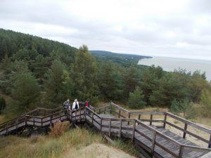 Национальный парк «Куршская коса» встретил нас серо-голубым небосклоном после проливного ночного дождя. Небо потихоньку прояснялось, и гулять по дюнам стало приятно. Куршская коса — узкая и длинная полоска песка в виде сабли — протянулась на 98 км от Зеленоградска до Клайпеды (Литва). Она появилась 7000 лет назад и отделяет Куршский залив от Балтийского моря, поддерживается сегодня благодаря заботе человека. Этот национальный парк включен в список Всемирного наследия ЮНЕСКО. Здесь много достопримечательностей: Танцующий лес, Росситтенский лес, Королевский лес, Лебединое озеро, орнитологическая станция «Фрингилла» и красивые приморские поселки.