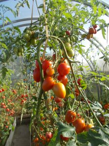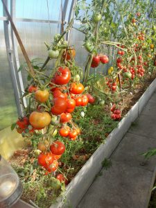 Названия томатов говорили сами за себя: желтая «Банановая нога», крупная, вишневого цвета «Капля», оранжевый и малиновый Земледелец F1, Лимеренс F1, Гренадер F1, Дерибас.